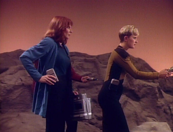 whilst Worf and Wesley monitor from the ship. Riker offers to negotiate, the